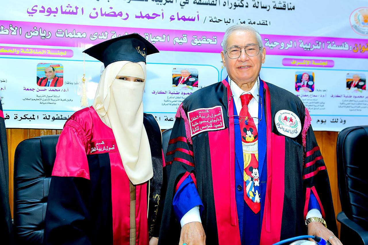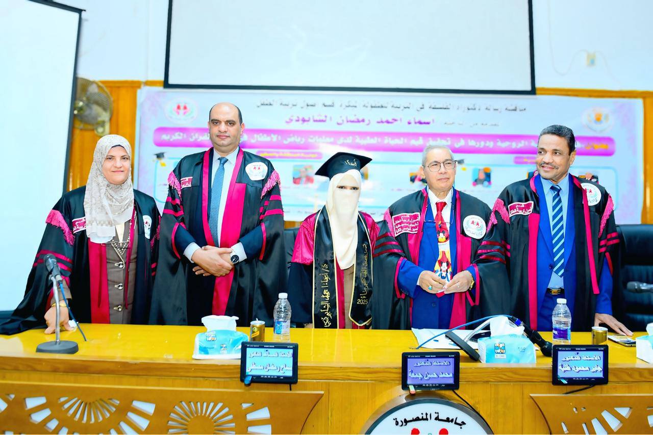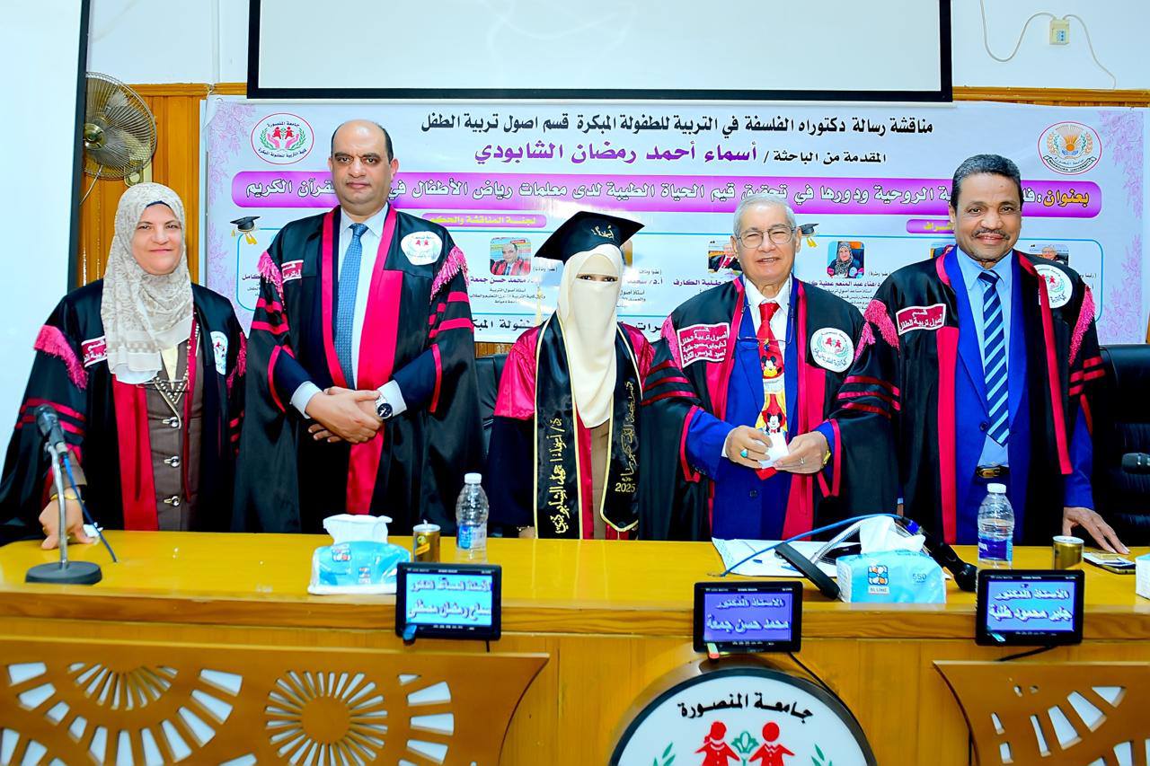 - the doctoral degree in Early Childhood Education was awarded to the distinguished researcher, Asmaa Ahmed Ramadan El-Shaboudi, from the Department of Foundations of Child Education, specializing in (The Typical Child), for her dissertation entitled: (The Philosophy of Spiritual Education and its Role in Achieving the Values of a Good Life among Kindergarten Teachers in Light of the Holy Quran).