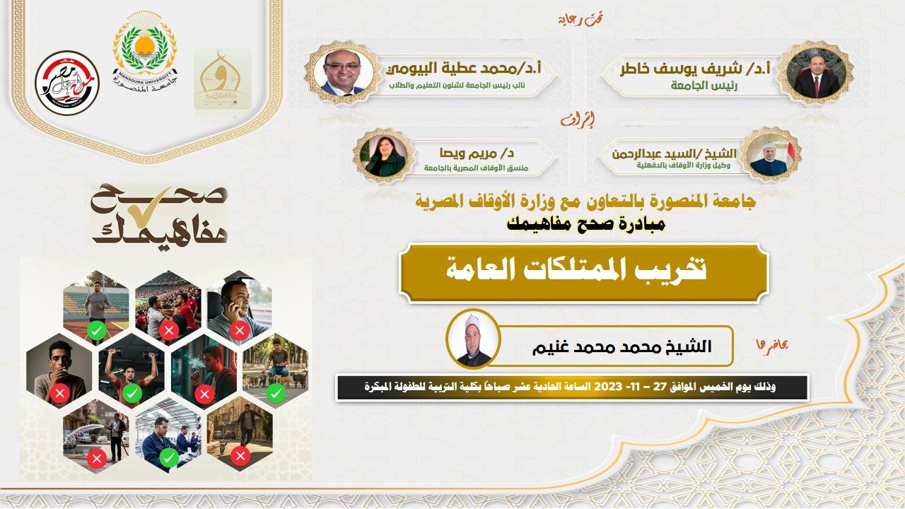 في إطار اهتمام كلية التربية للطفولة المبكرة – جامعة المنصورة برفع الوعي المجتمعي وتصحيح مفاهيم الطلاب حول قضايا الحفاظ على الممتلكات العامة، نظمت الكلية بالتعاون مع إدارة مديرية الاوقاف بالدقهلية ندوة تثقيفية بعنوان صحح مفاهيمك "تخريب الممتلكات العامة" ، حيث استعرضت مخاطر تخريب الممتلكات العامة وأثرها السيء على اقتصاد المجتمع ، وذلك في يوم الخميس الموافق 28 نوفمبر 2025